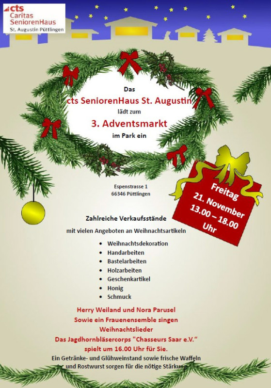 Das Caritas SeniorenHaus St. Augustin lädt ganz herzlich zum 3. Adventsmarkt am 21. November in den Park der Einrichtung in der Espenstraße 1 ein. Zahlreiche Verkaufsstände erwarten die Besucher in der Zeit von 13.00 bis 18.00 Uhr in weihnachtlicher Atmosphäre. Natürlich ist wie immer für das leibliche Wohl bestens gesorgt.